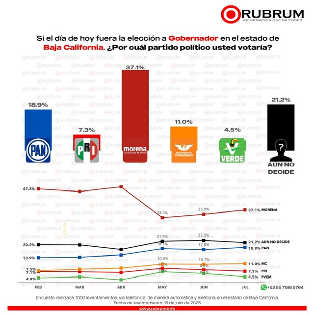 Los partidos opositores en Baja California aumentaron sus preferencias ligeramente con respecto al mes de junio, y para el mes de julio el PAN suma 18.9 puntos; MC sube a 11 y el PRI queda en 7.3 puntos.