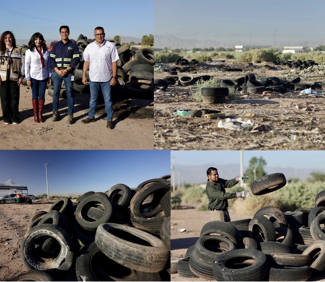 Mexicali, B.C.- Uniendo esfuerzos por comunidades más limpias, la presidenta municipal Norma Bustamante encabezó la jornada de recolección de llantas de un predio ubicado en la colonia Mártires de la Democracia.