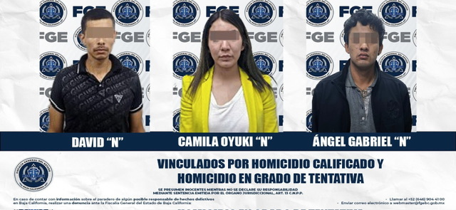 Mexicali, B.C.- La Fiscalía General del Estado obtuvo la vinculación a proceso de Camila Oyuki “N”, David “N” y Ángel Gabriel “N”, presuntos integrantes de una célula criminal, por los delitos de homicidio calificado y homicidio calificado en grado de tentativa.